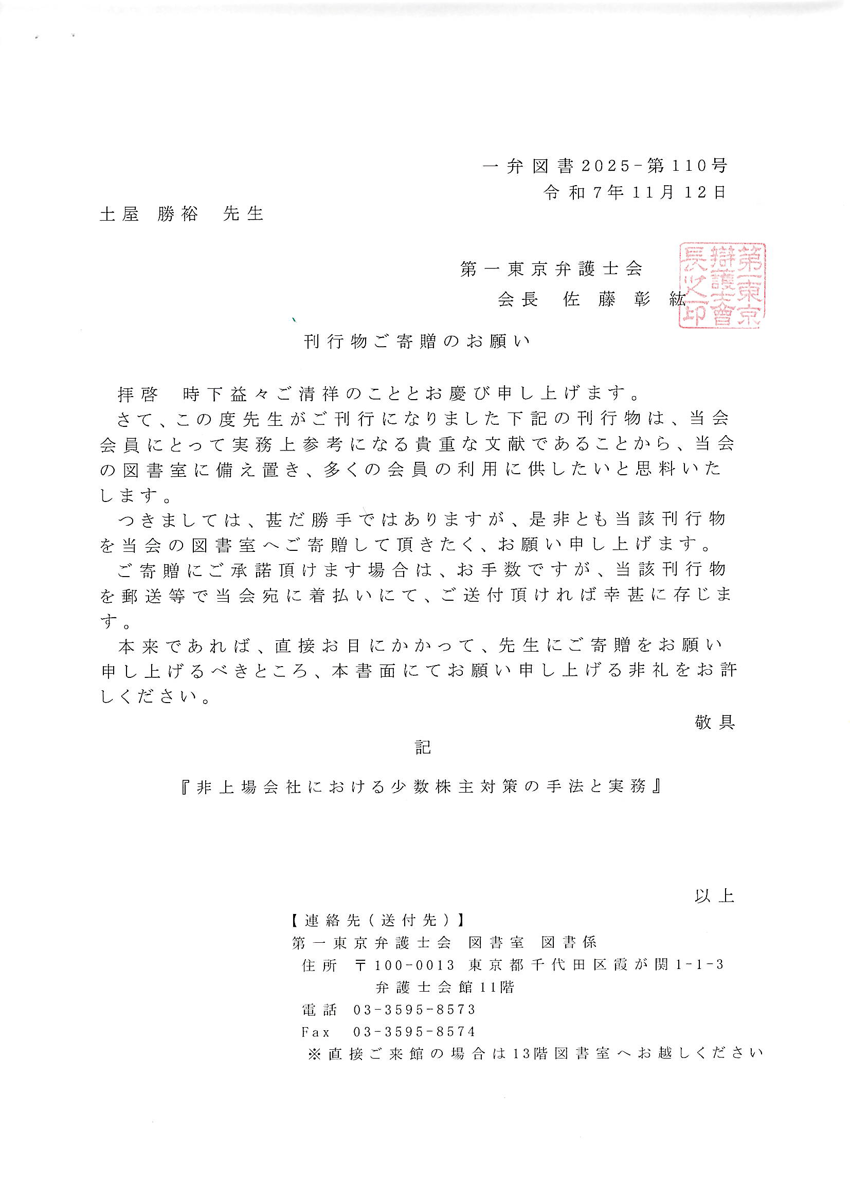第一東京弁護士会より、当職執筆書籍『非上場会社における少数株主対策の手法と実務』につき、図書室への寄贈依頼を受領いたしました。